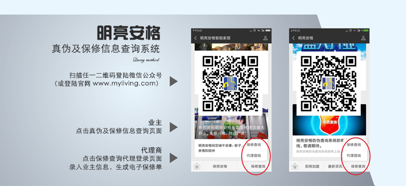 明亮安格公司緊跟時代發(fā)展,建立電子保修服務系統(tǒng),全國連網(wǎng)數(shù)據(jù)庫支持,正品保證,手機上即時錄入與查詢,讓安裝信息一目了然,可以為客戶提供更優(yōu)質服務的同時,使客戶更有歸屬感,信任感。